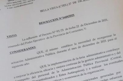 La Municipalidad de Bella Vista estableció por Resolución N°1649/2021 la adhesión al Decreto N°93/2021 emanado del Poder Ejecutivo de la Provincia de Corrientes que declara Feria Administrativa para todo el Personal Municipal desde el 3 al 7 de enero inclusive....