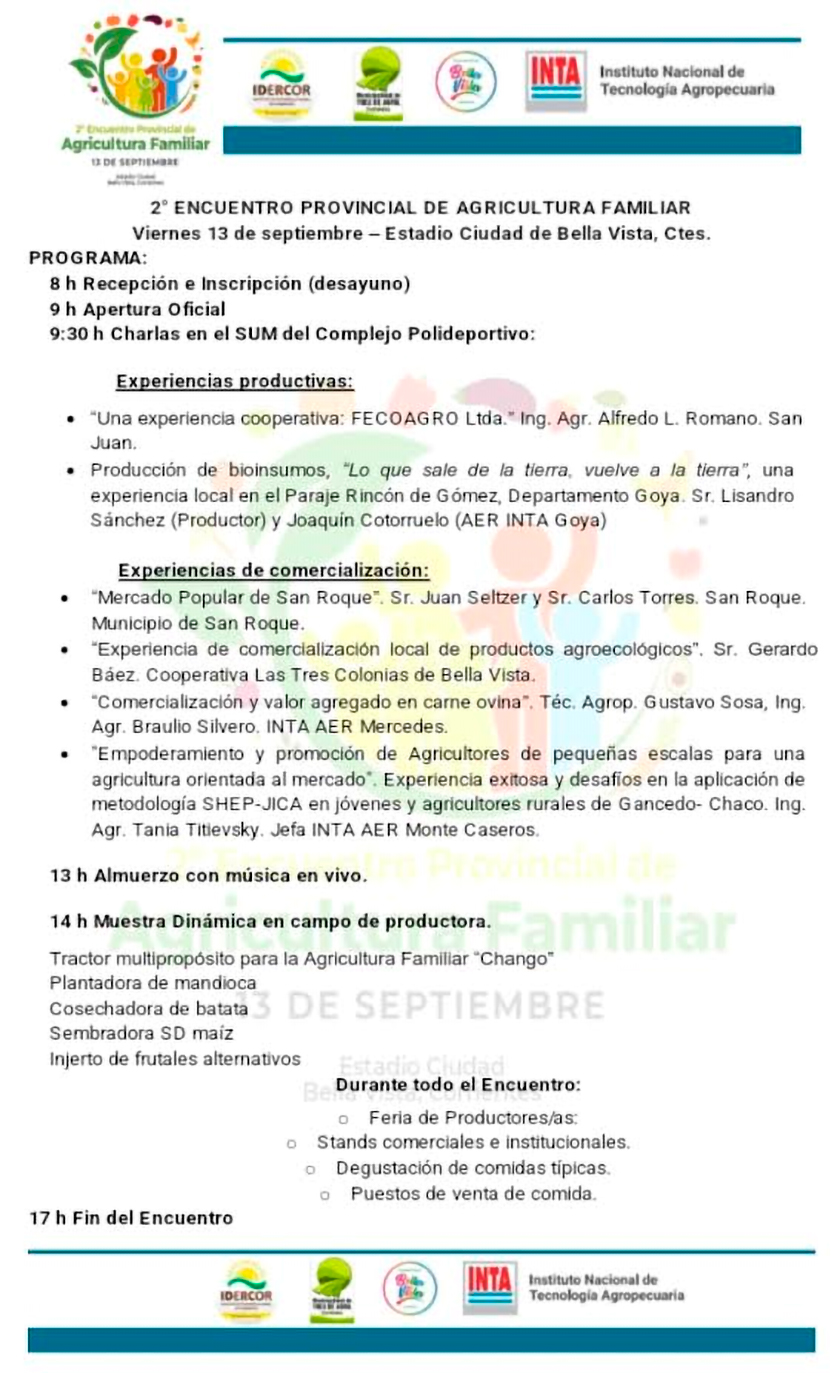 La Secretaría de Producción de Bella Vista junto con el Instituto de Desarrollo Rural de Corrientes (IderCor) y el Instituto Nacional de Tecnología Agropecuaria (INTA) lanzaron oficialmente el 2do Encuentro Provincial de Agricultura Familiar que tendrá lugar en el estadio Ciudad el próximo viernes 13 de septiembre. En la presentación, la intendente Noelia Bazzi destacó la importancia para la economía local de los productores familiares, y resaltó la importancia de estos encuentros.