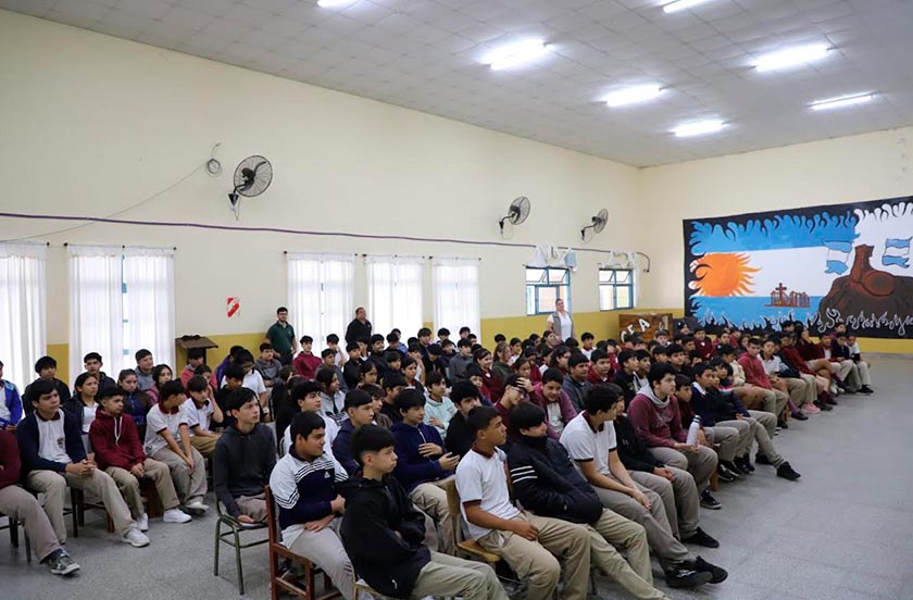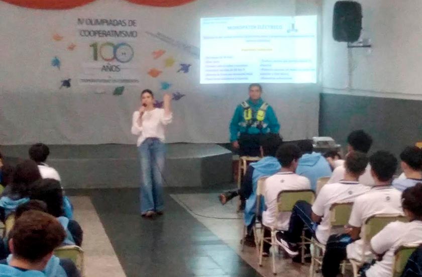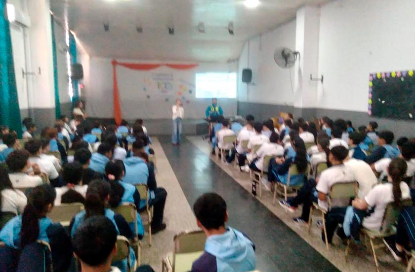 La jornada titulada «Hoja de ruta, hacia una conducción responsable y consciente», comenzó en la Escuela Técnica “Dr. Juan E. Martínez” donde la especialista, docente de la Universidad Nacional del Nordeste, licenciada Melissa Barasz junto a un agente de la Dirección de Tránsito y Seguridad Vial desarrolló un temario que luego replicó ante el alumnado del IABeV en su salón de usos múltiples.